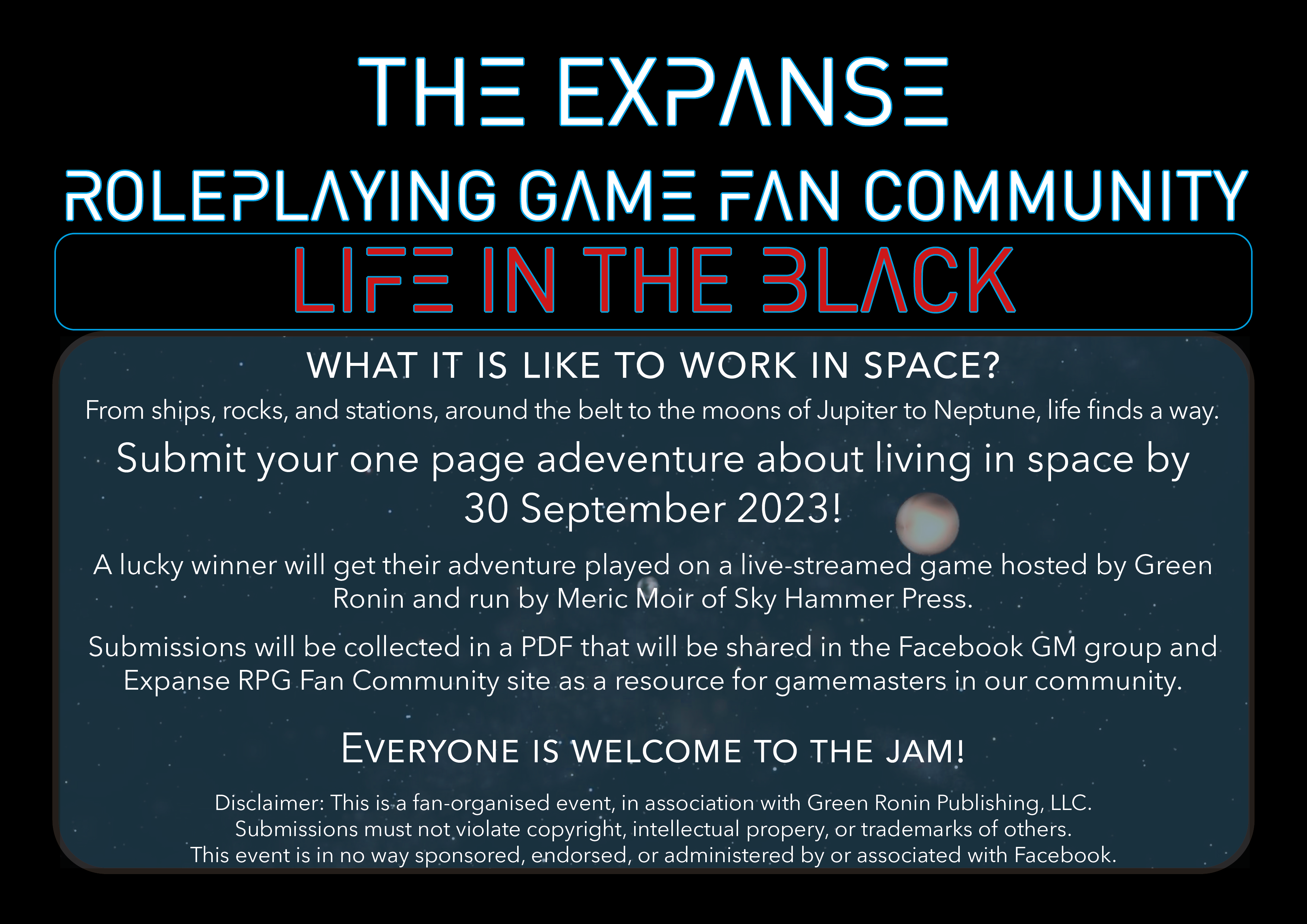 And! As an added surprise-bonus-treat for this year’s jam, everyone that submits a one page adventure automatically gets a chance to win a giveaway generously donated by Green Ronin of the latest Trades of the Expanse: Scout supplement. Winners will be randomly drawn at the conclusion of the jam, announced after the poll.